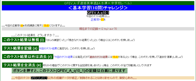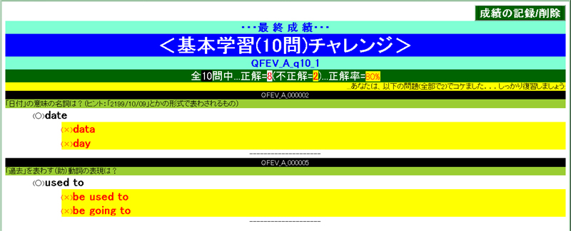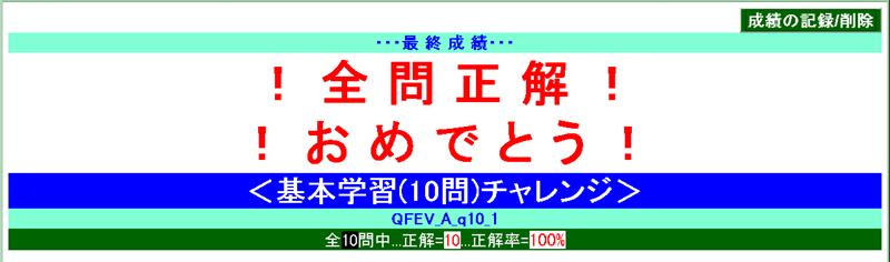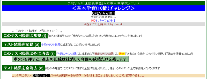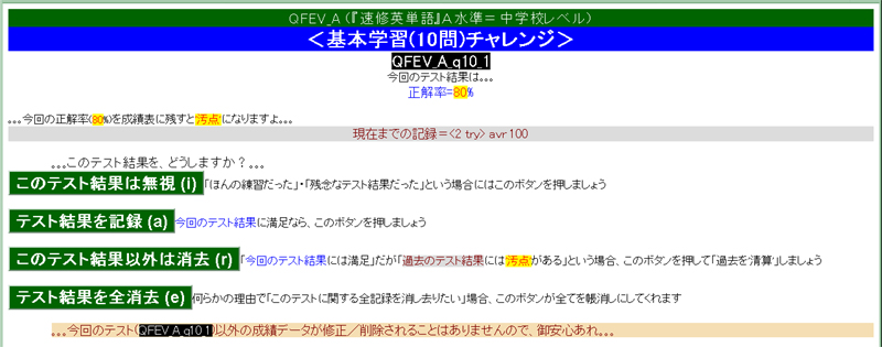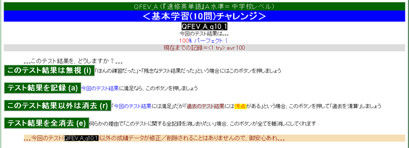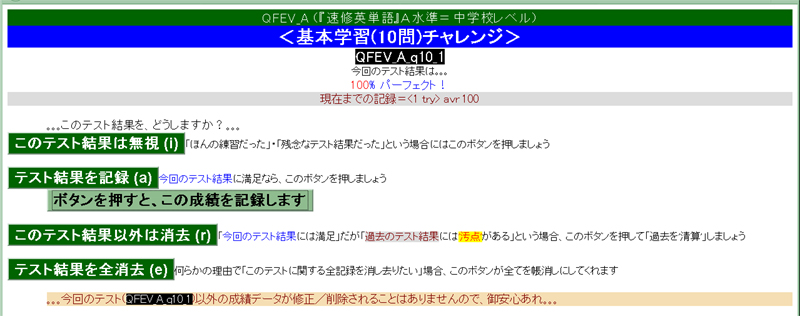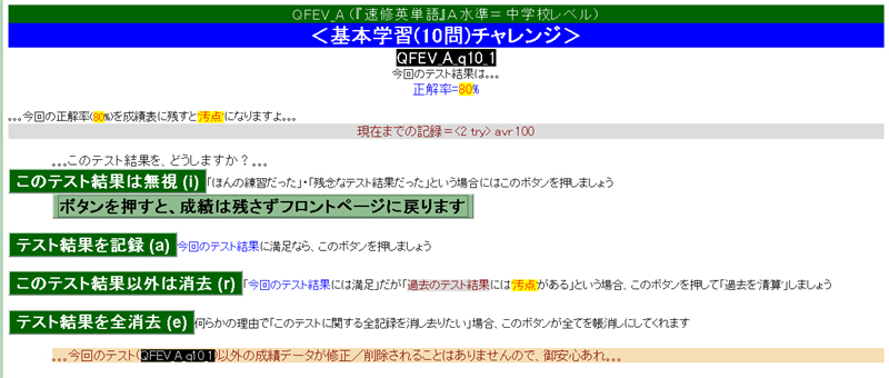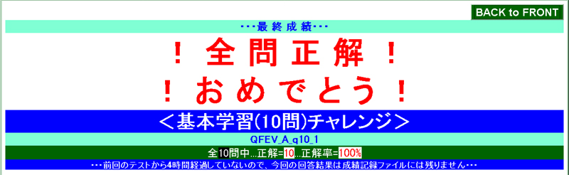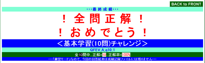 ・・・全学習範囲からランダムに100問出題されます・・・が、不正解の選択肢を選んだ時点で打ち切りになります ― 100問すべてに正解できずに途中打ち切りの憂き目に遭った場合は、[NEXT⇒(次の問題へ)]を押す前に[CANCEL(問題回答中止)]を押して証拠隠滅の上、再挑戦しましょう。